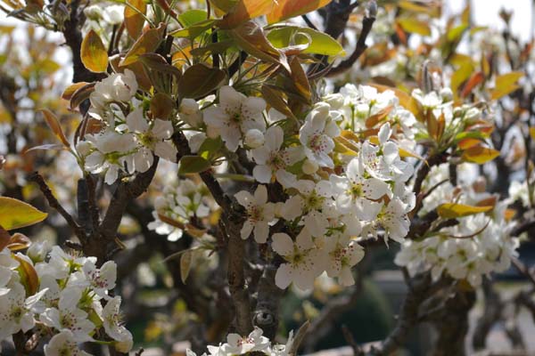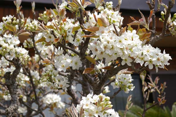 この下の白い花は、梨の花です。今満開なんです♪とっても綺麗♪