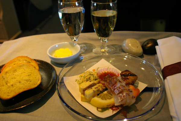 ガラスが触れ合う音や、ナイフフォークの重なり合う音。エコノミーでは聞けない音がします♪