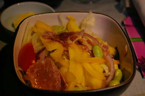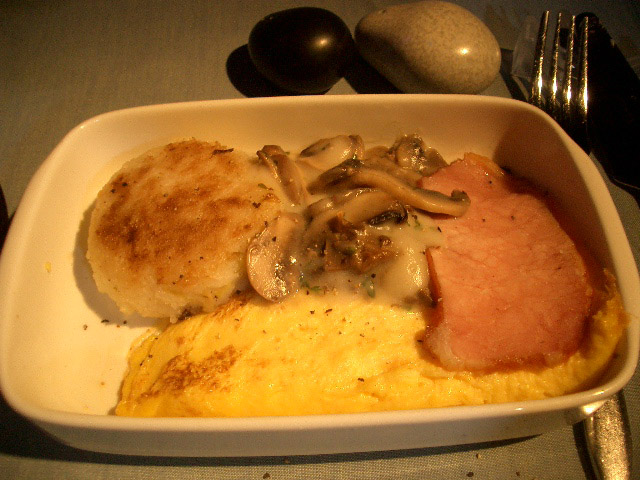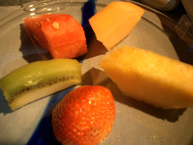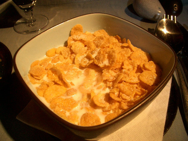 果物から始まり、エコノミーよりもずっと美味しい朝食でした。コーンフレークまでついてたよ♪