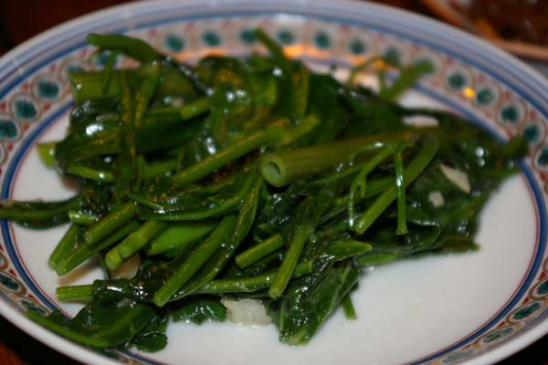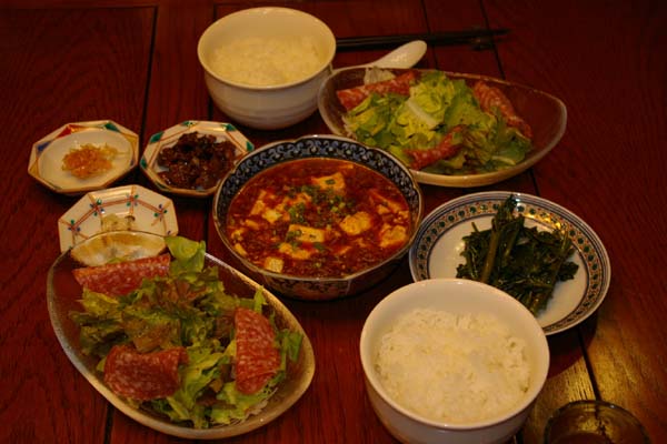 とりあえず、ご飯だけ炊いて、サラダもつけて・・・、で、大好きな麻婆豆腐♪ 空芯菜