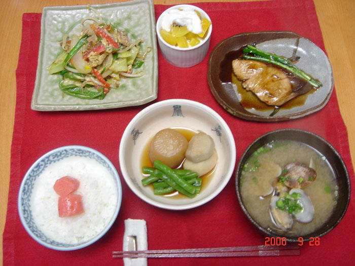 明太子とごはん 味噌汁 ぶりの照り焼き 野菜炒め 煮物 果物とヨーグルト